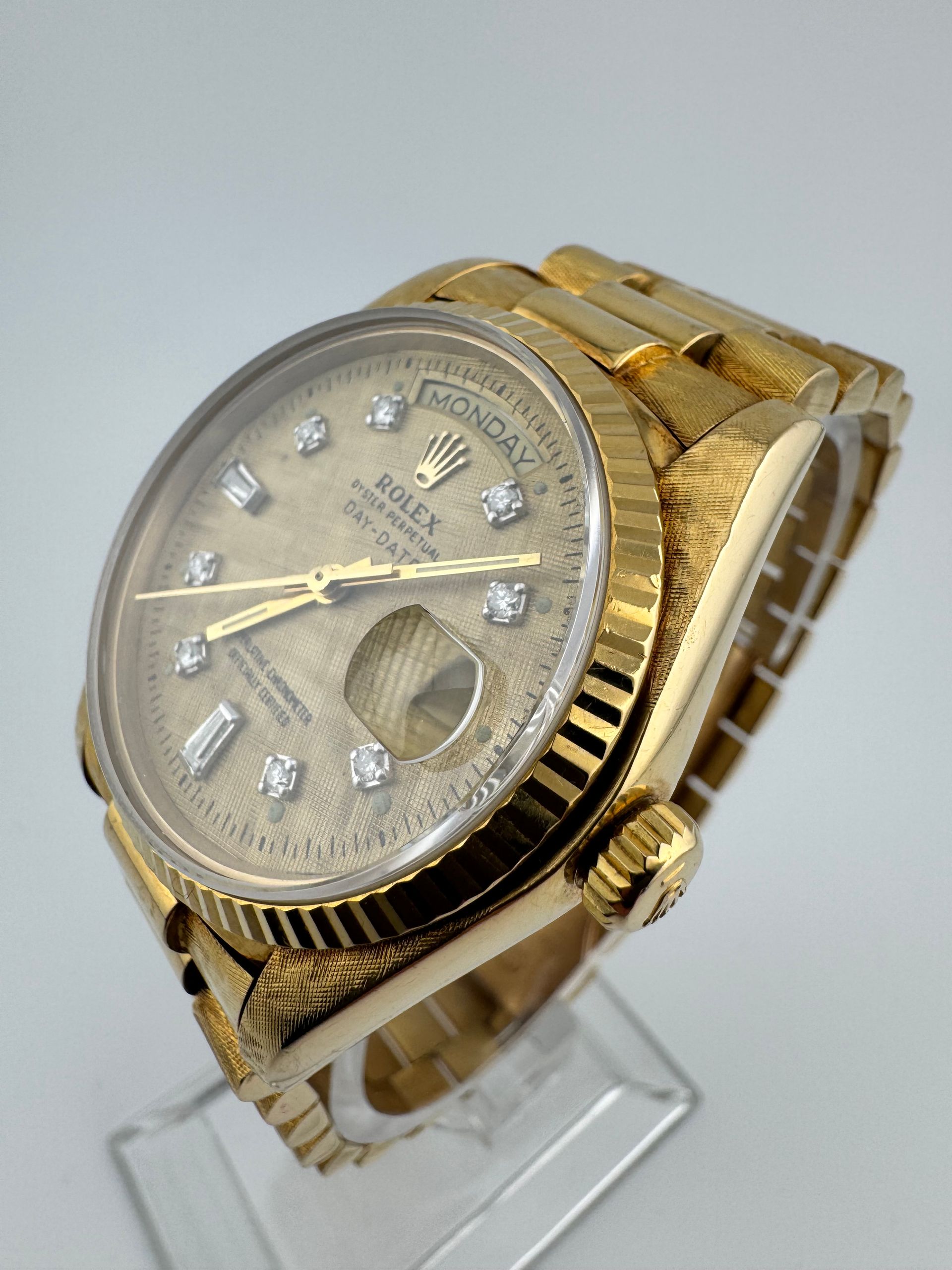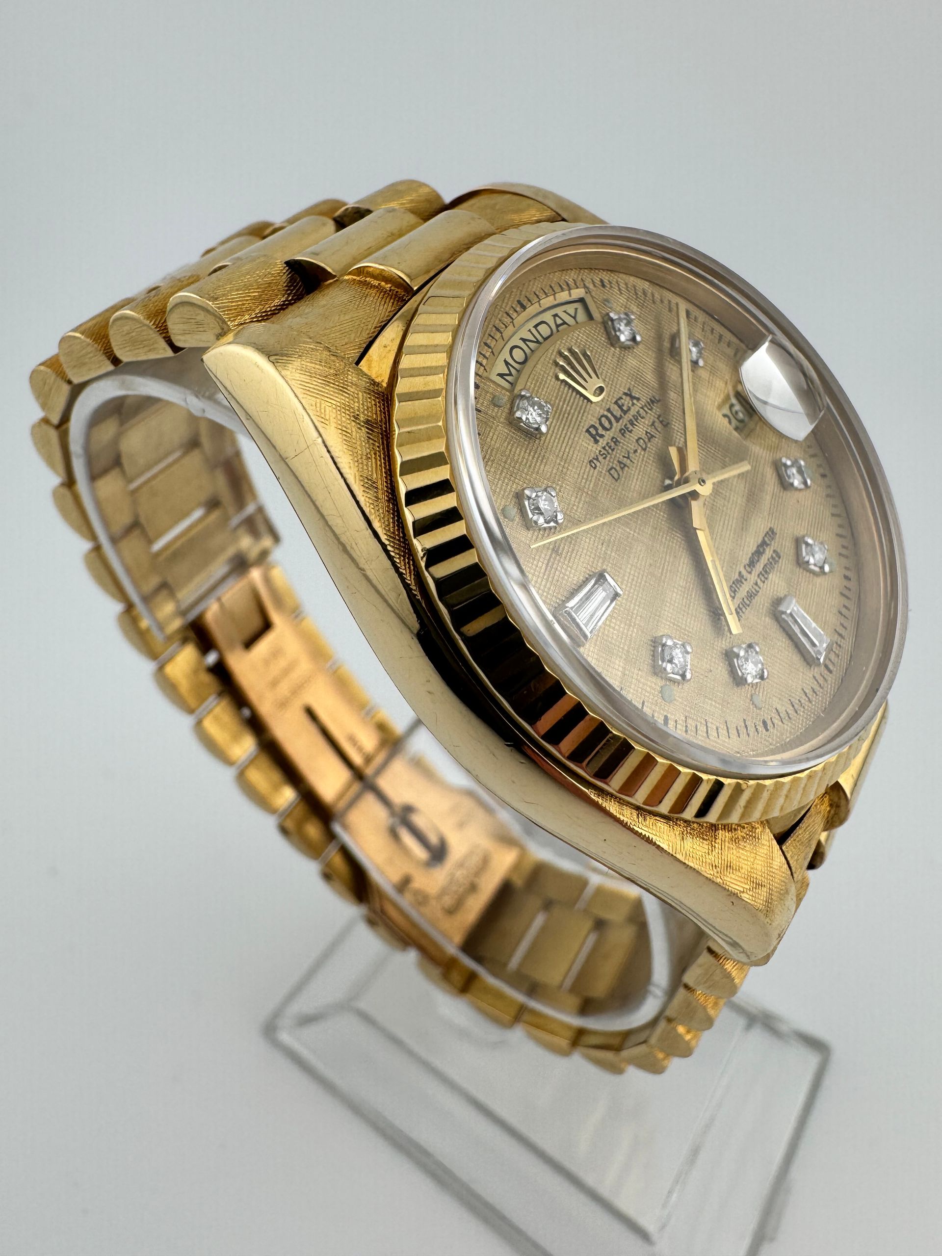 While customized pieces are not considered “all-original” by strict collectors, they carry a unique appeal for those who value individuality and one-of-a-kind design. A Rolex 18038 with a custom dial and engraving blends the timeless presence of the Day-Date with a personalized touch, making it a meaningful statement piece for its wearer.